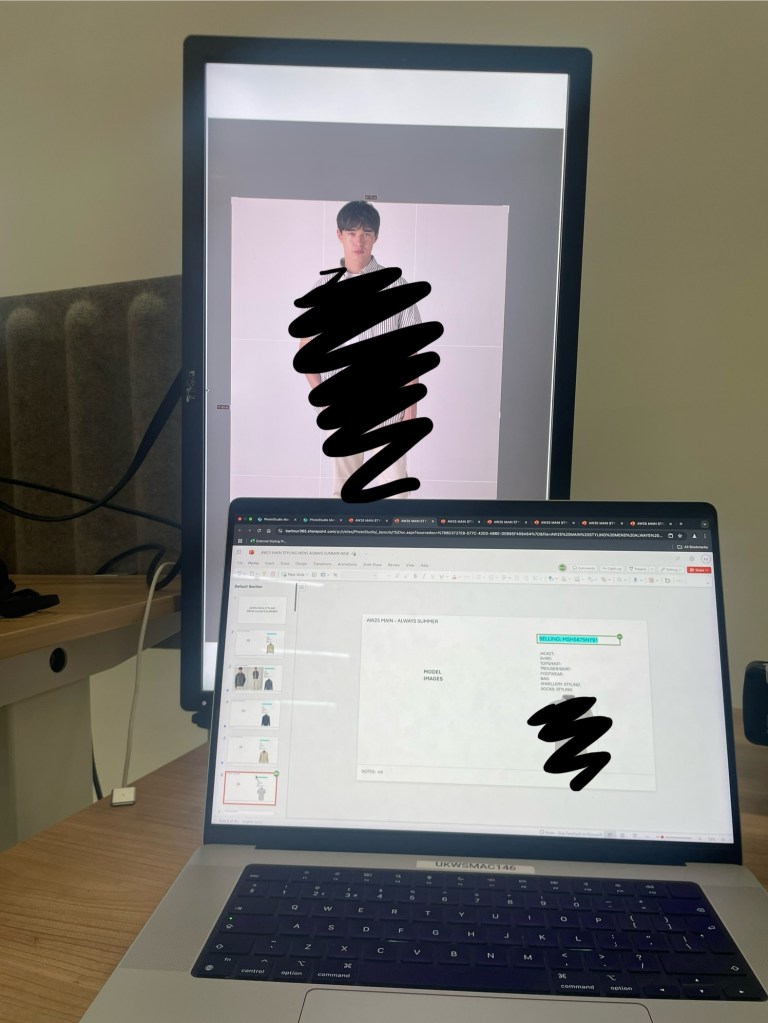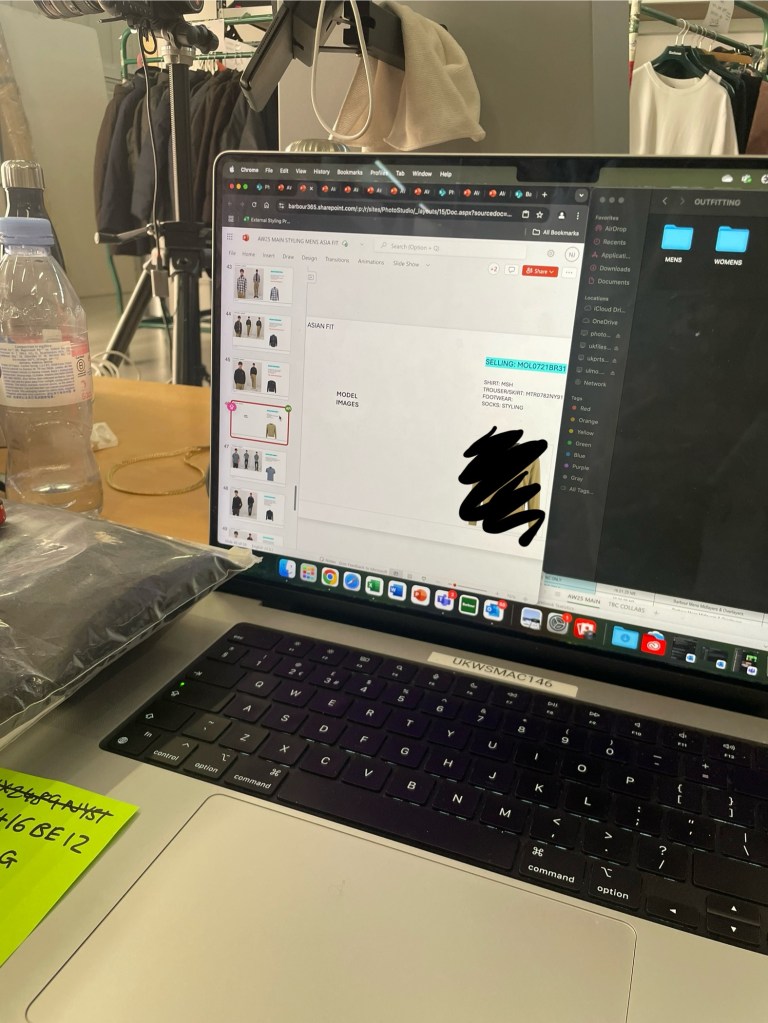 When they had gathered enough looks, the next part of the process was shooting the looks on models. We had a total of around eight models, including four males and four females, a few of them being new to working for Barbour. While the photographer was exporting the images into a specific folder for easy access, I would immediately start adding these photos to the styling decks. There’s a deck for each collection, and within each deck, I would ensure there was a dedicated slide for each individual sample. My job was to ensure that the images were placed on the correct slides corresponding to the selling sample of the look in the image, and I would also add all necessary written details. This included specifying key details such as the primary selling piece, which for example could be a knitted jumper, I would note down what trousers, underlayer, jacket (if there was one), footwear, and accessories were paired with it. If the items were Barbour, I would reference their specific product codes, and for items sourced externally from brands like ASOS, COS, H&M, or other retailers, I would make sure to note this down as well.
